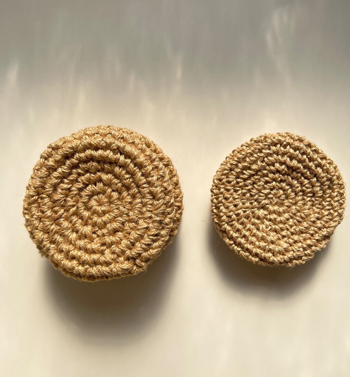 写真の小さい方 (ポットをのせた方、編み目の細かい方) がシングルです。