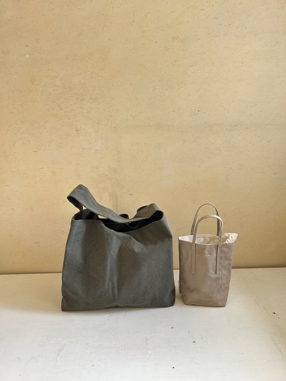裏地にロウ引き加工された帆布を使用することで自立するバッグになっています
